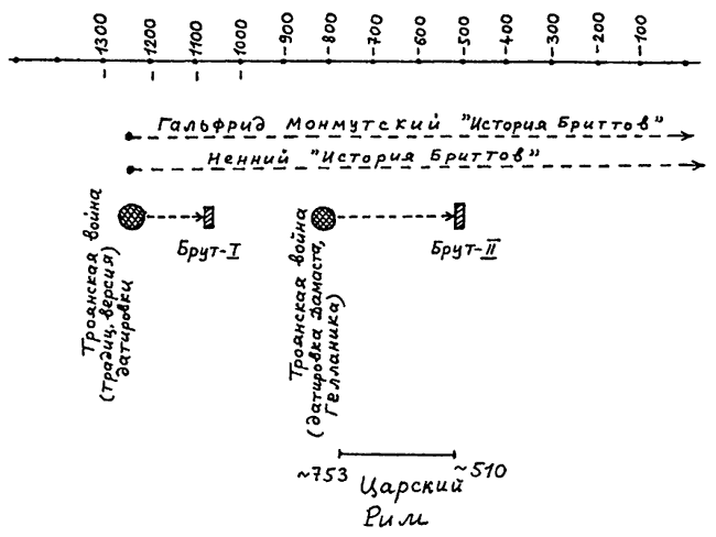 На рис. 17 и 18 мы отметили историческую эпоху, описанную Гальфридом (в традиционных датировках). Это практически тот же интервал, что и у Ненния, то есть от Троянской войны (XII или XIII веков до н. э.) до VIII века н. э. Хотя книга Гальфрида подробнее книги Ненния, тем не менее, будучи растянута на такой огромный исторический интервал (в две тысячи лет), она покрывает его далеко не полностью, а с большими лакунами. Впрочем, Гальфрид странным образом этого не замечает и неторопливо и плавно ведет свой рассказ, не подозревая, что временами он, оказывается, перепрыгивает через целые исторические эпохи.