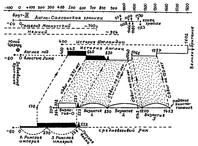 Рис. 17. Скалигеровская хронология английской и византийской истории. Пунктиром отменены эпохи, якобы описанные в древнейших английских хрониках.