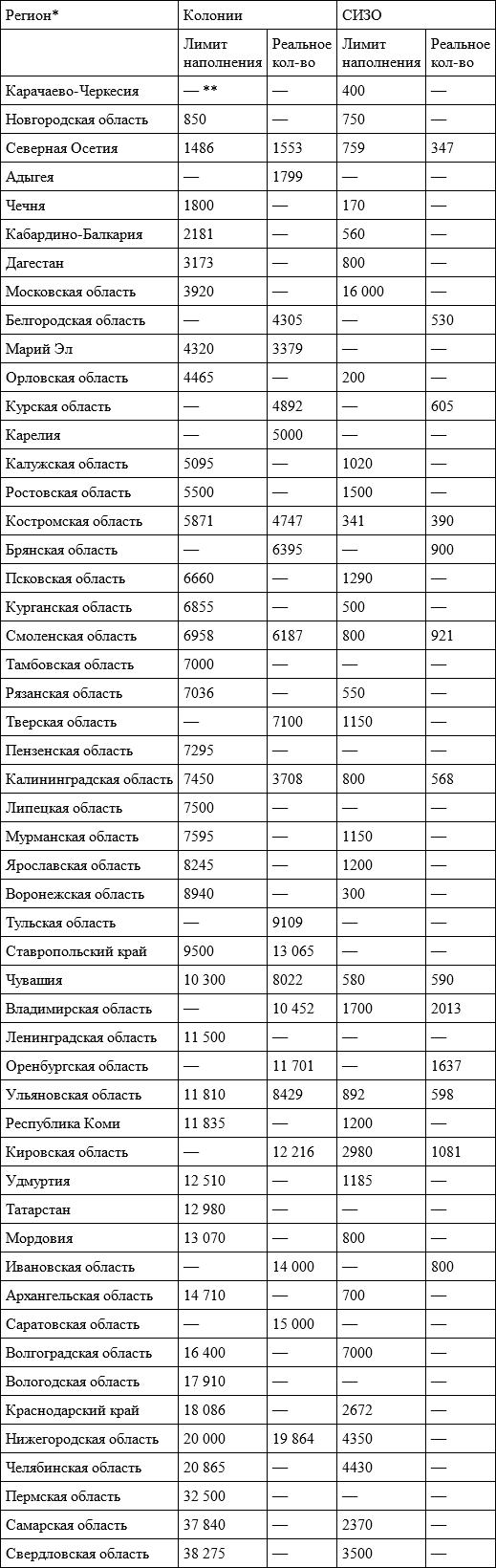 Советскому наследию – я это подчеркиваю как профессиональный географ – присущ особый пространственный характер уголовно-исполнительной системы. УИС России имеет характерное географическое разделение труда, оставленное в наследство от СССР. Эта система состоит из мест предварительного заключения (СИЗО), расположенных в крупных центрах, и «исправительных колоний», где осужденные отбывают наказание, в основном вне городов, в отдаленных районах, на периферии. Федеральная служба исполнения наказаний (ФСИН) не публикует статистических данных о распределении заключенных в зависимости от географии регионов, но, используя информацию, размещенную на веб-сайте региональными тюремными властями, можно построить таблицу, отражающую географическую картину мест лишения свободы в России.