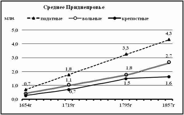 Из графиков следует, что на интервале 1654–1719 годы прирост численности «вольных» был больше, чем «крепостных». На интервале 1719–1795 годы — наоборот. На интервале 1795–1857 годы прирост «крепостных» практически ничтожный. Это следствие «закрепощения» еще недавно бывших «вольных» малороссов. Но самое главное, в Среднем Приднепровье на всем интервале крепостного права: