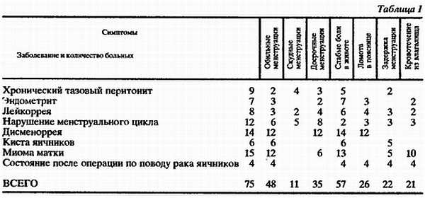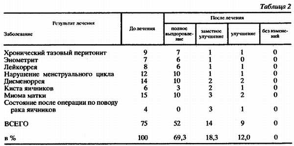 Из 75 пациенток 34 страдали гинекологическими заболеваниями от 3 до 6 месяцев, 35— от 6 месяцев до года и более, 6 — больше двух лет.