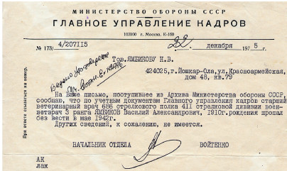 Ответ из Архива Минетстерства Обороны СССР