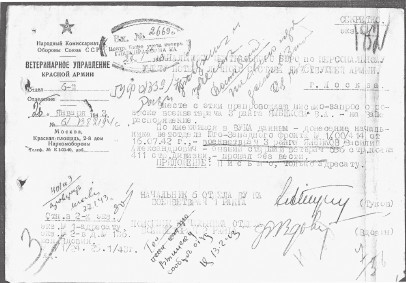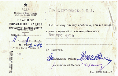 Сообщение из Ветеринарного управления Красной армии о том, что В. А. Ямбиков пропал без вести. 1943