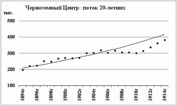 Провал в потоке 20-летних — это повторение провала в потоке растущих детей. Он обусловлен какими–то катаклизмами второй половины 1880?годов. Поэтому равномерный ежегодный прирост 20-летних в целом по Черноземному Центру существовал до 1906 года и составлял около 3%, то есть больше Нечерноземного Центра.