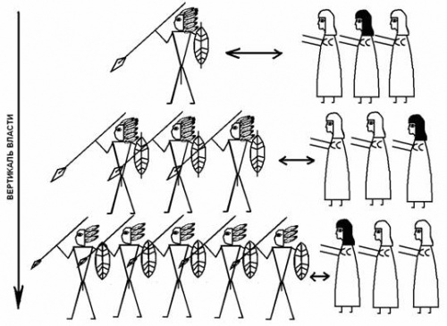 Эта пирамидальная иерархическая структура по сей день копируется, например, в российской армии. Ранг самца в иерархии определяется определенными знаками на погонах, а рядовой состав искусственно подвергают унижениям, пыткам и лишают возможности секса, чтобы сбить ранговые амбиции и заставить беспрекословно подчиняться.