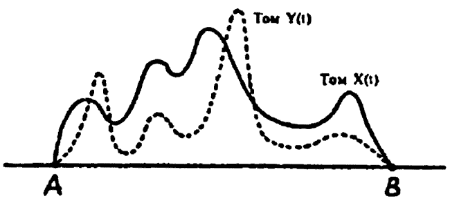 Главная примета здесь — максимумы (всплески) на графике. Они могут становиться выше или ниже в различных хрониках, говорящих об одном и том же, но взаимное положение их должно быть одинаково. Именно то, насколько точно совпадают максимумы при наложении друг на друга двух различных графиков, и называется здесь «корреляцией» (то есть взаимозависимостью). Высокий уровень корреляции — значит, графики действительно совпадают, значит, рассматриваемые две хроники говорят об одном и том же (и за это они называются «зависимой парой текстов»), низкий уровень корреляции — графики и хроники чужие друг другу («независимая пара»).