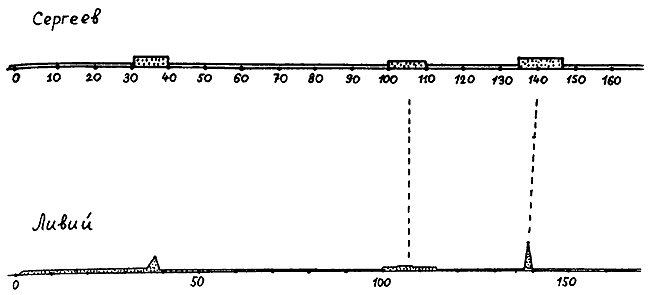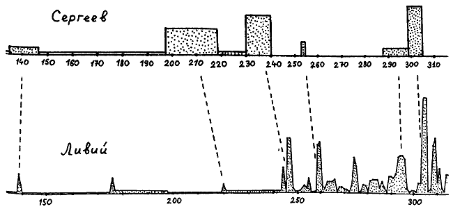 Согласно скалигеровской хронологии, эти тексты описывают события на интервале якобы 757–287 годы до н. э. Итак, здесь А = 757 год до н. э., В = 287 год до н. э. Оба текста описывают одну и ту же историческую эпоху, примерно одни и те же события. Наглядно видно, что графики объемов делают свои ОСНОВНЫЕ всплески практически одновременно. Для количественного сравнения функций следует предварительно сгладить «мелкую зыбь», то есть вторичные всплески, накладывающиеся на основные, первичные колебания графиков. При вычислении коэффициента p(X, Y) мы сгладили, усреднили эти графики, чтобы выделить лишь их ОСНОВНЫЕ локальные максимумы, в количестве, не превышающем пятнадцати. Оказалось, что здесь p(X, Y) = 2 ? 10-12. Малая величина коэффициента указывает на ЗАВИСИМОСТЬ сравниваемых текстов. В данном случае это неудивительно. Как мы уже отмечали, оба текста описывают один и тот же период в истории «античного» Рима. Малое значение коэффициента p(X, Y) показывает, что если рассматривать наблюдаемую близость точек всплесков обоих графиков как случайное событие, то его вероятность чрезвычайно мала. Как мы видим, современный автор В.С. Сергеев достаточно аккуратно воспроизвел в своей книге «античный» оригинал. Конечно, он дополнил его своими соображениями и комментариями, но, как выясняется, они не влияют на характер зависимости этих текстов.