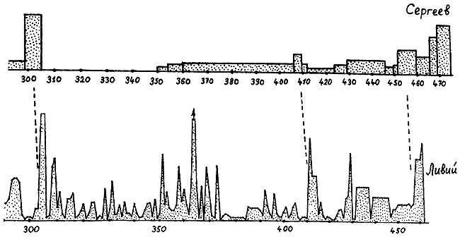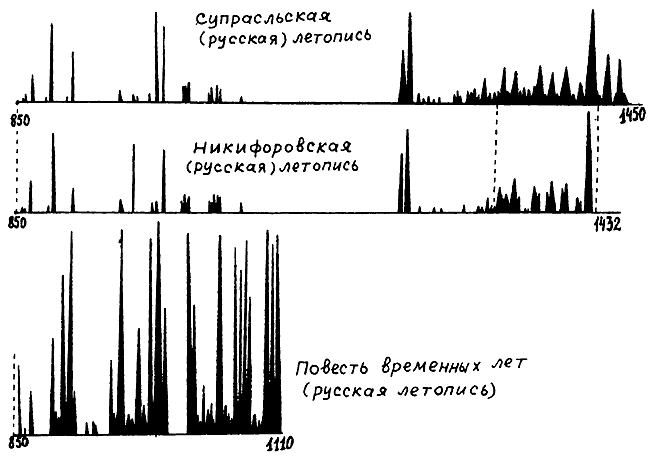 Рис. 13. Графики трех зависимых летописей: Супрасльской, Никифоровской и «более богатой» Повести временных Лет. Подсчеты показывают, что имеется ярко выраженная зависимость точек всплесков.