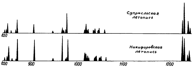 Рис. 12. Графики объемов зависимых летописей: Супрасльской и Никифоровской. Всплески графиков — практически одновременны.