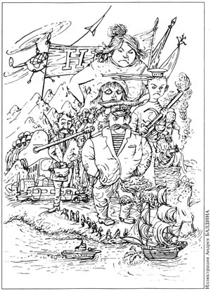 К вечеру прибыло телевидение. К прибытию ТВ строй охраны был восстановлен, и местные, дабы не выглядеть простой толпой, стали напротив таможни, вооружившись знаменами, которые они купили в лавке национальной символики. Хитрый лавочник сбывал за копейки из-под полы символику оппозиционных партий. Кто сейчас был в оппозиции, жители поселка не знали, но поверили продавцу на слово. Вот и выстроилась на набережной в итоге грозная демонстрация, протестующая против своеволия властей. Телевизионщики живо извлекли из своего автобуса аппаратуру и бывшую популярной лет десять назад диссидентку Новозадскую. Сейчас она работала диссиденткой в соседнем государстве и неистово любила местные власти. Новозадская перед камерой долго ругала свои власти, хвалила местные, призывала поголовно перейти на латинский алфавит и принять помощь как символ вечной дружбы. Потом пресса попыталась взять интервью у жителей поселка. Но они не хотели говорить на государственном языке, и ТВ уехало восвояси.