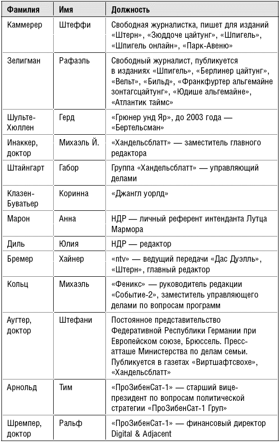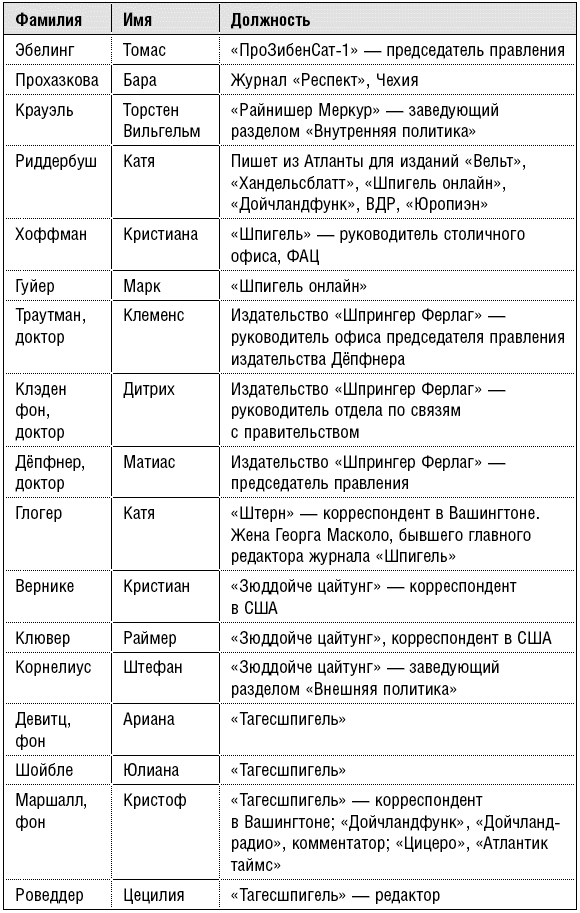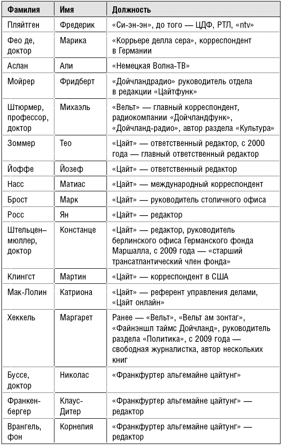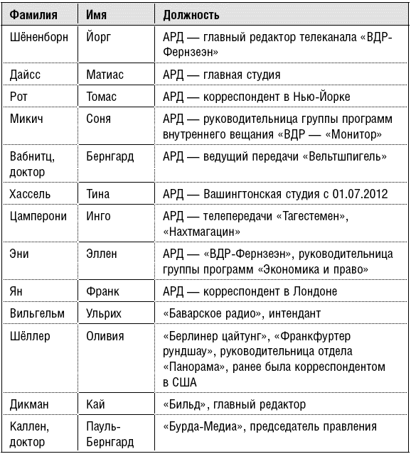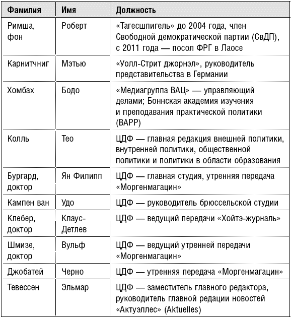 Журналисты объясняют нам происходящее в мире, влияют на наше мнение, делают политику. Но кто объясняет происходящее в мире самим журналистам, кто влияет на их мнение и, тем самым, делает политику? Вне всякого сомнения, к числу тех, кто этим занимается, относится и «Атлантический мост». Его члены заботятся о том, чтобы на общественное мнение оказывалось влияние в полном соответствии с откровенно проамериканскими установками их организации. Именно по этой причине выдающихся журналистов, особенно представителей публично-правовых телекомпаний «АРД» и ЦДФ, приглашают на встречи и поездки, организуемые «Атлантическим мостом», или на беседы с членами этой организации. В одних только годовых отчетах о деятельности «моста» за 2006–2012 годы были поименно упомянуты 88 журналистов, причем 26 из них представляли публично-правовые СМИ. Ниже приводится поименный список этих журналистов. Мы не утверждаем, что все они являются членами либо «молодыми лидерами» данной организации или были таковыми в прошлом. Список, в основу которого были положены годовые отчеты о деятельности «Атлантического моста» с 2006/2007 по 2011/2012 годы, приводится нами лишь в качестве документального подтверждения их контактов с «Атлантическим мостом», утверждающим, что такие контакты имели место[272].