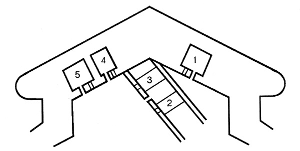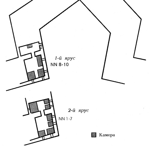 В левом фланке Нарышкина бастиона на обоих ярусах двух казематов в январе 1826 г. было устроено десять камер. Расположение их показано на схеме. (Подробно о нумерации камер см.: Вершевская М.?В. Указ. соч. С. 117–119.)