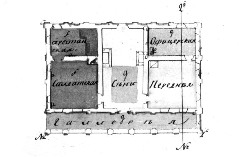 На первом этаже в доме коменданта во второй половине декабря 1825 г. были устроены три камеры для одиночного содержания декабристов; точное расположение этих помещений неизвестно. Об истории здания см. статью Н.?Б. Алексеевой в настоящем сборнике.