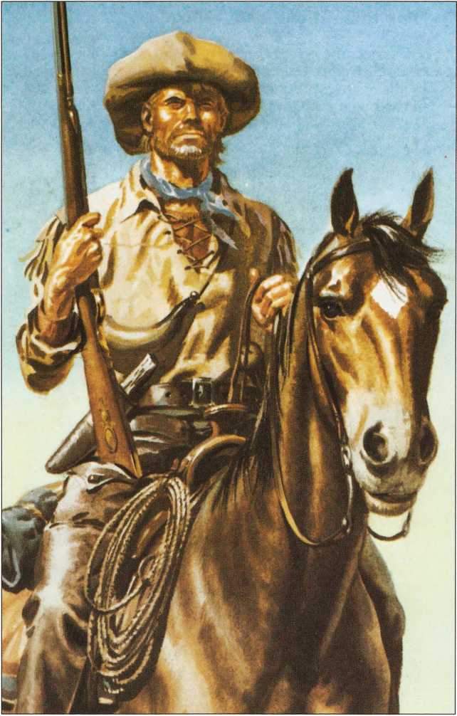 Один из первых техасских ковбоев в одежде из оленьих шкур, с ружьем, заряжающимся с дула, и длинным охотничьим ножом