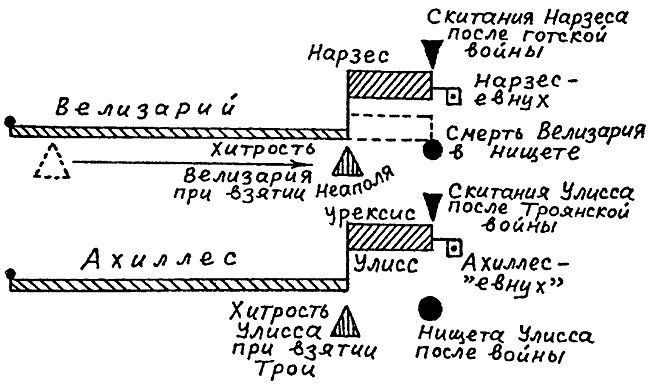 Рис. 29. Наглядное изображение наложения «биографии» ромейско-греческого полководца Велизария (из истории Готской войны) на «биографию» греческого полководца Ахиллеса (из истории Троянской войны).