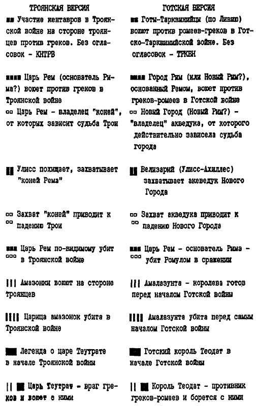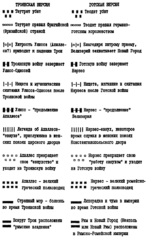 Рис. 30а. Сравнение более мелких событий античной Троянской войны (скалигеровская датировка: XIII век до н. э.) и средневековой Готской войны якобы в Италии (скалигеровская датировка: VI век н. э.).