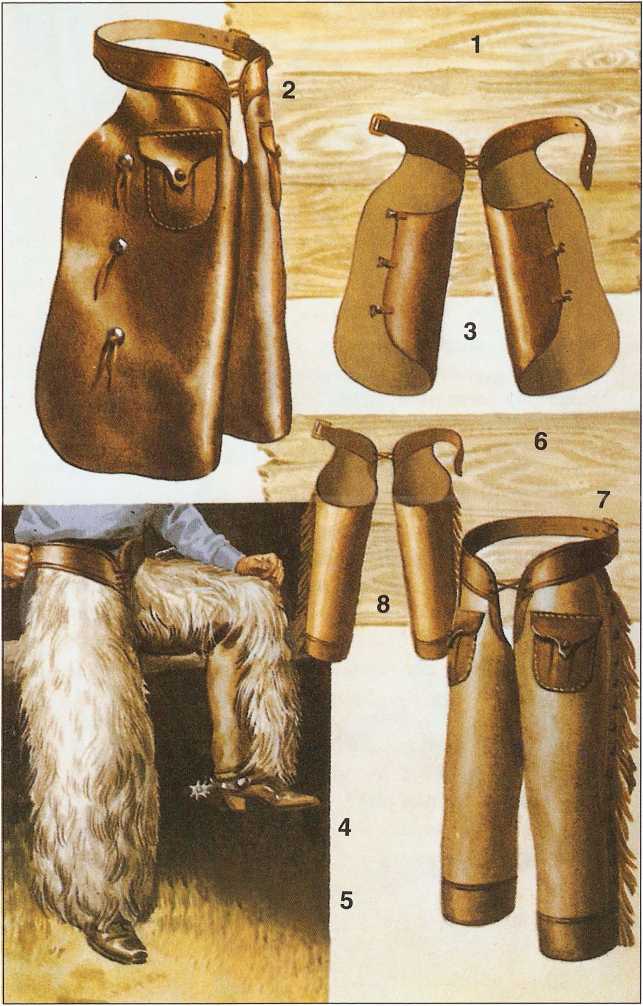 Одной из наиболее удивительных вещей в снаряжении ковбоя были тяжелые кожаные штаны, известные как шэпы. Их полное мексиканское название — чапарейхос (чепы — произносится как шэпы). Известны три типа чапарейхос. Первыми появились шэпы в виде двух кожаных труб, куда вставляли ноги. Они известны как шэпы «дробовик», поскольку две кожаные трубы напоминают дробовик-двустволку. Они часто бывали по бокам украшены бахромой.