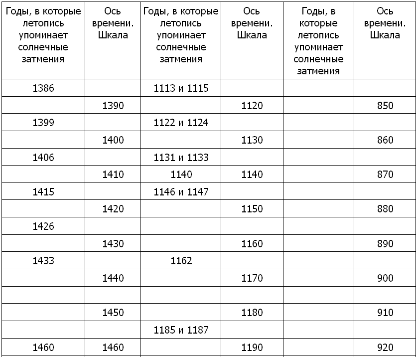 Таблица 1. Наглядное статистическое сопоставление солнечных затмений, отмеченных в псевдо-летописи псевдо-Нестора, с описанными у его «псевдо-продолжателей» (а на деле первых летописцев).