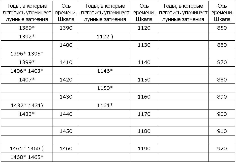Таблица 2. Наглядное статистическое сопоставление лунных затмений, отмеченных в псевдо-летописи псевдо-Нестора, с описанными у его «псевдо-продолжателей» (а на деле первых летописцев).