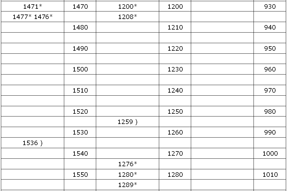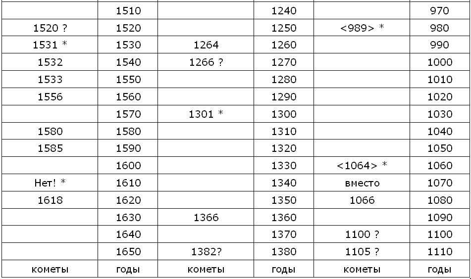 Звездочками обозначены появления кометы Галлея (якобы — Авт.). В угловых скобках < > даны появления кометы Галлея (якобы — Авт.), заимствованные из византийских записей.