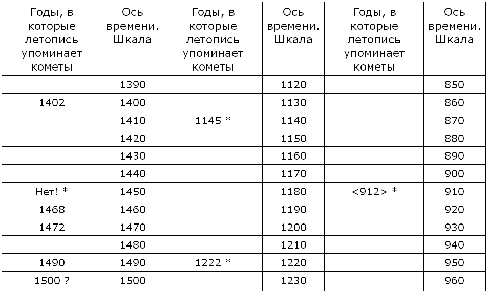 «Но в летописях есть записи и о других кометах, и если мы сопоставим их присутствие у „продолжателей“ с отсутствием их в „Начальной летописи“, то получим по принятому уже нами образцу следующую таблицу 3.