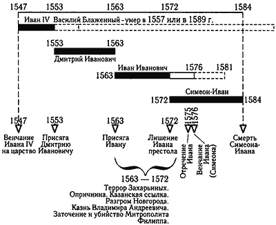 Единственное отличие нашей версии событий рассматриваемого 10-летнего периода (1553–1563) от миллеровско-романовской состоит в том, что мы приписываем их правлению малолетнего Дмитрия, а не якобы «устранившегося от дел» Ивана IV.