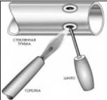 Чтобы вырастить целую кристаллическую «рощу», в отрезке стеклянной трубки закрепляют несколько проволочек. Трубку нагревают в пламени горелки до размягчения стекла и шилом проделывают в ней 2-3 пары отверстий. В них пропускают проволочки, оставляя внизу свободные концы для контакта с ртутью.