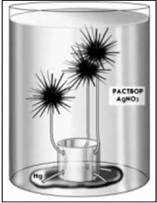 Шарик на серебряной проволоке, погруженной одним концом в ртуть, в растворе нитрата серебра обрастает колючей «прической» и становится похожим на репей.
