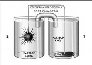 Шарик на конце проволоки играет роль своеобразного насоса, перекачивающего ртуть из одного стакана в другой. По трубочке с кристаллами KNOs (соляному мостику) двигаются ионы серебра, по проволоке – свободные электроны, появившиеся при окислении ртути, и сама ртуть в виде тонкой пленки. Через несколько часов на шарике образуется потемневший налет серебра, а на проволоке – кристаллы амальгамы.
