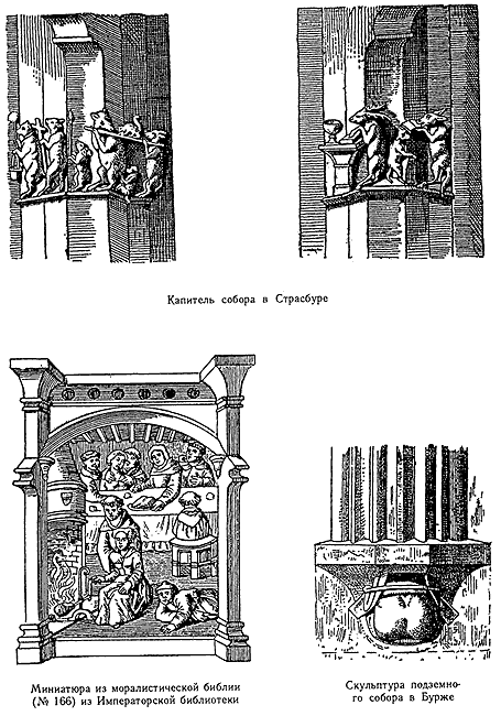 Рис. 157. На верхних рисунках — фрагменты с капители Страсбургского кафедрального собора. Медведь несет кропильницу со святой водой, за ним с крестом волк, за ним заяц с факелом и т. д. Далее: Миниатюра из средневековой моралистической Библии (№ 166) из Императорской библиотеки. Средневековые христианско-«вакхические» изображения, до сих пор сохраняющиеся в некоторых западноевропейских соборах. Взято из [1064].
