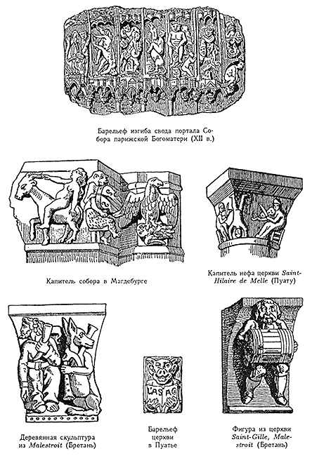 Если непристойные средневековые изображения — лишь пригласительные вывески в западноевропейских храмах вплоть до XVI века — а местами даже позже! — то, что означают изображения на них ведьм, чертей и т. п.? Позднейшие, где черти тащат грешников в ад, имеют, конечно, устрашающее значение. Но что значат, например, такие, где черт играет на гитаре, обнаженные женщины скачут верхом на козлах и ослах в припадке сладострастия? Какую смысловую нагрузку несли каменные обезьяны, исполняющие разнузданные пляски с откровенным эротическим оттенком? Таковы, например, каменные скульптуры на капителях кафедрального собора в Магдебурге. Или вот, например, барельеф на своде портала знаменитой церкви Notre Dame de Paris якобы XII века с непристойными изображениями: обнаженные женщины вступают в сношения с ослами, козлами и друг с другом, клубок человеческих тел, черти, развлекающие любовными упражнениями прихожан и прихожанок. Что значит скульптура, выставленная напоказ публике на портале церкви в Плормеле (Ploermel), где молодая жена натягивает нос своему мужу в ночном колпаке, а сама радостно улыбается? См. рис. 157, 159 и 160.