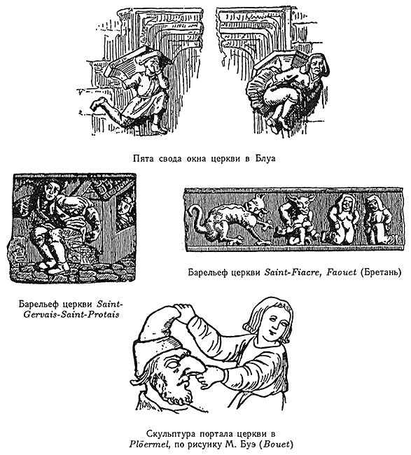 Попытки объяснить подобные средневековые изображения — а сохранилось их немало — тем, что они является якобы «карикатурами», помещенными в священных храмах, на тех, кто там служит, — несерьезны. Шампфлери продолжает: «Найдется ли такое парадоксальное воображение, чтобы определить соотношение подобной, выходящей из пределов возможности шутки с благочестивым местом, где изваяно это изображение? Какие авторитетные влияния были нужны, чтобы не остановить руку ремесленника, исполнявшего такие детали?… На стенах некоторых старинных христианских храмов мы с удивлением видим изображения половых органов человека, которые угодливо выставлены напоказ среди предметов, предназначенных для богослужения. Как будто эхо античного символизма, такие порнографические скульптуры с удивительной невинностью высечены каменотесами… Эти… фаллические воспоминания старины, находимые в темных залах (где и совершись вакханалии — Авт.) кафедральных соборов центральной Франции, особенно многочисленны в Жиронде. Бордосский ученый-археолог Лео Друэн (Leo Drouyn) показывал мне курьезные образчики бесстыдных скульптур, выставленных напоказ в старинных церквах его провинции, которые он скрывает в глубине своих папок» [1064]. Цит. по [544], т. 5, с. 661.