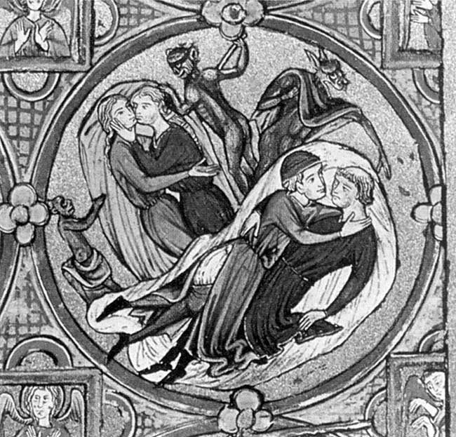 Рис. 161. Старинная миниатюра из «Библии для бедных», Франция, якобы около 1220 года. «Запретная любовь: женский и мужской гомосексуализм поощряют демоны» [643:2], с. 166, илл.4.