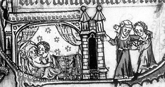Рис. 162. Старинная миниатюра «Молодой человек входит в публичный дом» из нидерландского Часослова. Современные комментаторы объявляют ее «назидательной». Взято из [643:2], с. 166, илл. 3.