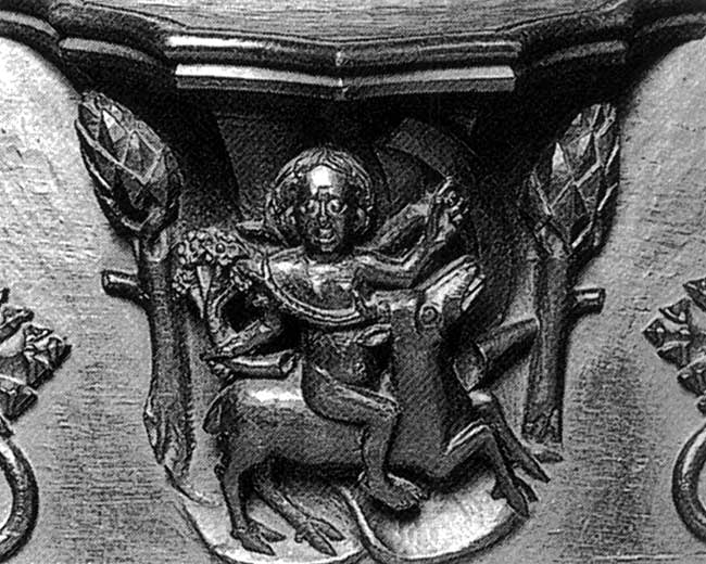 Рис. 164. Обнаженная женщина верхом на олене изображена на кресле в церкви в Страсфорде-на-Эвоне. Якобы XV век. Взято из [643:2], с. 166, илл. 3.