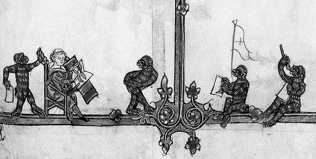 Рис. 165. «Обезьяны и монах… Одна из обезьян показывает зад монаху. Рисунок на полях Миссала. Франция, 1323» [643:2], с. 156, илл. 4.