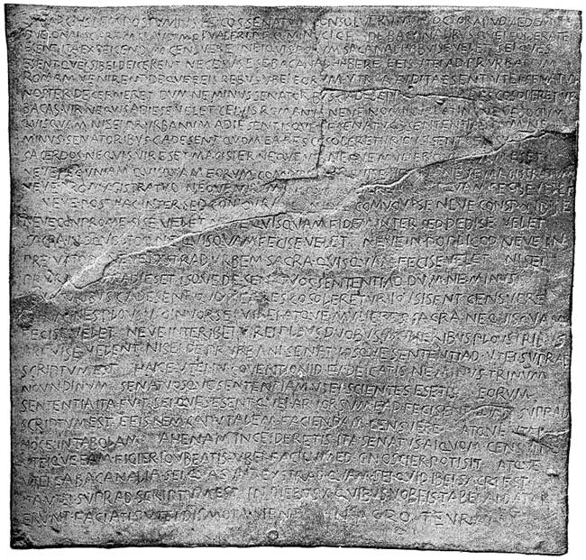 ДРАГОЦЕННЫЙ ПАМЯТНИК, сохранившийся от этого времени, передает нам важный правительственный акт Сената в его оригинальной редакции. РИМСКИЙ СЕНАТ ЭТИМ АКТОМ ВОСПРЕЩАЛ ВСЯКИЕ ПРОЯВЛЕНИЯ ВАКХИЧЕСКОГО КУЛЬТА НА ТЕРРИТОРИИ СОЕДИНЕННОГО РИМСКОГО ГОСУДАРСТВА, ПОД СТРАХОМ СМЕРТНОЙ КАЗНИ… Указ Сената, ВОСПРЕЩАЮЩИЙ ВАКХАНАЛИИ, начертанный на медной доске, был в таком виде разослан по всем округам и прибит всюду на видных местах во всеобщее сведение. В 1640 году одна из подобных таблиц была открыта в весьма уединенном месте, в древней стране Бруттаев» [304], т. 1, с. 362–363.