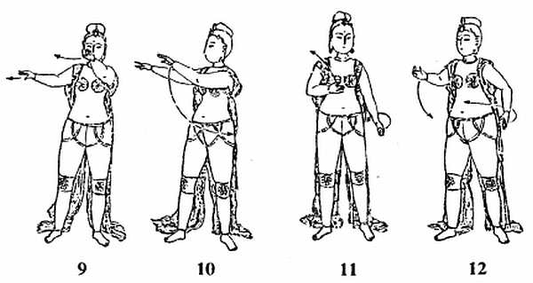 2) После кругового движения левой рукой влево опустите ее, а затем поднимите к груди. Правая рука, сменяя левую, поднимается к груди, ладонь направляется на объект, рука вытягивается и начинается испускание ци.