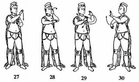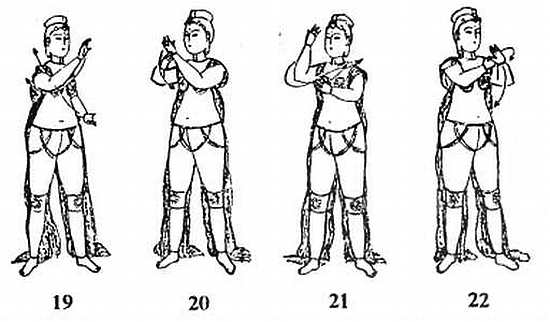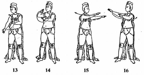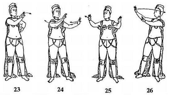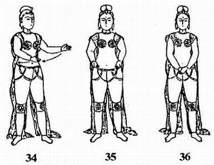3) Во время «набирания» ци поступает из земли и движется через пятки, бедра, поясницу, позвоночник, руки и кисти, во время «выведения» — исходит из пальцев в направлении удаленного объекта.