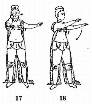 8) Продолжайте вытянутой левой рукой описывать круг в левую сторону, а правую руку поднимите по дуге и, выпрямив перед собой, опишите ею круг вслед за левой рукой (рис. 1-18).