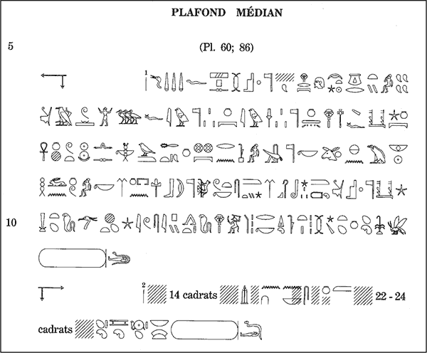 Рис. 6.88. Полная прорисовка всех иероглифов из двух столбцов иероглифических надписей, расположенных по обеим сторонам от фигуры Нут рядом с Круглым Дендерским зодиаком. Сверху — правый столбец, снизу — левый, который почти полностью был утрачен при выламывании зодиака. Взято из [1062:1], том Dendara X/1, с. 176.