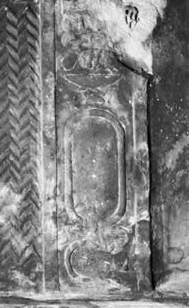 Рис. 6.91. Пустой картуш внизу левого столбца иероглифов сбоку от фигуры Нут. Здесь либо никогда не было надписей, либо они были тщательно зачищены. Египет, Дендерский храм. Фотография 2006 года.