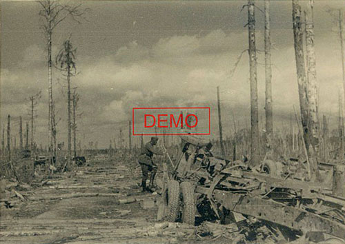 Набросал вот схемку. Получается, что если снайперу на дереве не угрожает быстрый и точный ответ из-чего-то серьезного типа пулеметов-минометов-орудий, а противостоят ему люди с винтовками и ПП, то работать ему — раздолье. Со снайперского прицела можно вполне работать на 600 метров. С открытого — хрена. Деревья, конечно, не все подходят, но с той же сосны — вполне работать можно, при том, что вполне можно себе там очистить нечто вроде амбразуры — ты дорогу видишь, а враг тебя — нет. Мало того, баллистика несколько изменяется при стрельбе вверх и вниз, поэтому снайпер, сделав поправку, будет попадать, а те, кто будет в него лупить с земли — скорее всего будут мазать, пули пойдут ниже. Ну и напоследок — трофейный снимок дороги в Синявино. Гать, вокруг растопыренный артобстрелами ломаный лес — прикиньте, где может сесть снайпер. Получается — только на дереве, иначе весь этот бурелом (а без бурелома — кустарник на опушке) будет мешать.