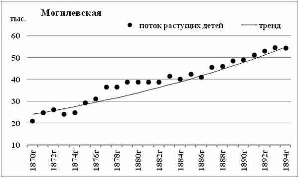 Могилевская губерния примыкает к Черниговской и Смоленской губерниям. Неравномерность потока растущих детей Могилевской губернии подобна потоку Черниговской губернии, но существенно меньше, чем в Смоленской губернии. Ежегодный прирост потока растущих детей у всех трех губерний — около 3,5%.