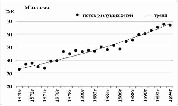 Минская губерния примыкает к Могилевской, Витебской и Волынской губерниям Поток растущих детей Минской губернии подобен Волынской губернии. Но ежегодный прирост потока растущих детей больше — около 3%.