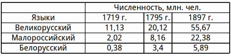 Для истории демографического развития русского народа надо знать распределение той части населения Царской России, которое в подавляющем большинстве относили себя к русским, к русской культуре, к родным русским говорам. Так как все великолепие, нежность и выразительность русских говоров от Карпат до Тихого океана разделили на три языка, то исследование переписей вынужденно буду вести с учетом этого разделения: