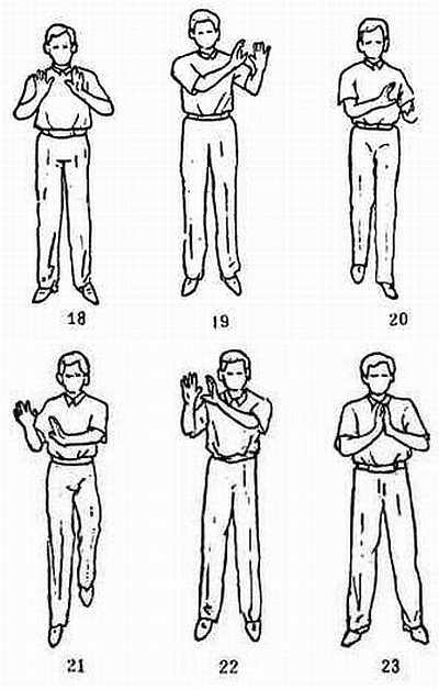 Для этого: а) мягким движением поместите ладони, наложенные друг на друга (для мужчин — правая рука сверху, для женщин — наоборот), на пупок и выполните ими по 18 вращений в одну и другую стороны (порядок смены направлений не имеет значения) в среднем или медленном темпе; б) потрите ладони друг о друга до появления жара; в) потрите лицо 18 раз: плотно прижав ладони к щекам, поднимайте их вверх до середины лба и с усилием возвращайте к щекам; г) постучите зубами 36 раз.