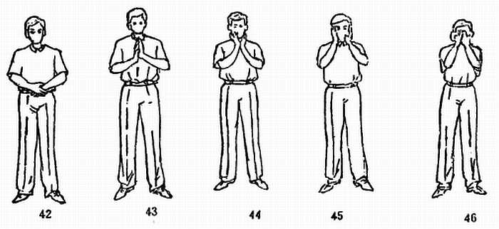 Сложите ладони перед грудью пальцами вверх и выполняйте ими маятниковые движения влево и вправо в среднем или медленном темпе (кончики пальцев не должны подниматься выше подбородка), сопровождая эти движения легкими наклонами корпуса в стороны. Во время выполнения упражнения можно медленно прогуливаться, шагать на месте или вообще не двигаться. При этом не следует забывать о координации движений рук и ног. Выполняя упражнение сидя или лежа, руководствуйтесь требованиями к упражнению 2.