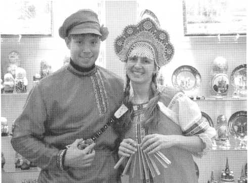 І насамкінець, пропонуємо читачам уважно подивитися на подану нижче світлину. Чи багато російського міститься у розпропагованому “російському стилі”? Прусський картуз і монгольська косоворотка на юнакові (про це йшлося у попередньому розділі), персидський сарафан і фінський кокошник на дівчині та на додачу ще і японський бог — мотрійка на задньому плані.