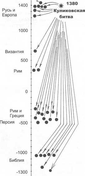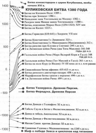 Рис. 9.6. Скалигеровская история «размножила» Куликовскую битву на множество фантомов. Показано — в какие именно эпохи они были ошибочно поставлены историками.